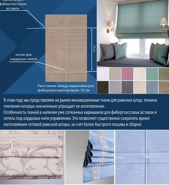 Экономичность — ткань закрывает оконный проем. Расход материала минимальный, при этом классические штор требуют гораздо большего метража ткани. Также в нашем ассортименте есть специальные ткани предназначенные исключительно для римских штор. В них уже предусмотрены карманы для вставок, которые обеспечивают образование декоративных складок. Это позволяет сэкономить на швейных работах и лентах.